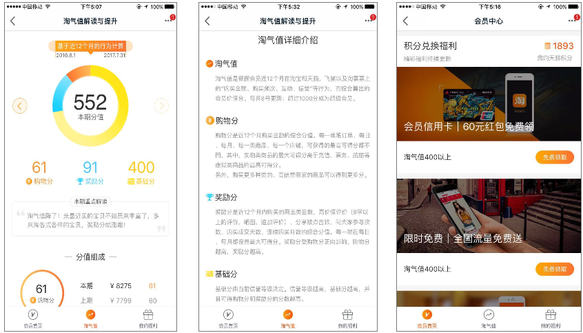 淘宝在去年的时候推出了淘气值,它是根据会员近一年来在淘宝,天猫,飞猪以及淘票票上的“购买金额、购买频次、互动和信誉”等行为,而综合算出的会员价值分。淘气值的多少能够反映该用户的信用评级,高级会员可以得到相应的权利。例如,获得一些代金券或者红包。淘宝的产品策略比较人性化,首先明确了淘气值的定义,来源和属性,紧接着,在界面下方又说明了淘气值能够干什么用,在哪里用,例如通过400积分能够得到价值60元的红包,或者是能够兑换全国的流量。它通过其他商品的价值来体现淘气值的价值,让用户感知到淘气值是具有真金白银性质的虚拟货币,能够交易到自己需要的物品。通过对其价值的认可,不知不觉的吸引别人去做相应的任务