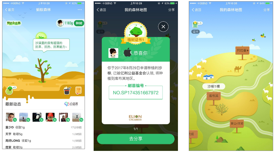 蚂蚁森林是支付宝推出,以环境保护为切入点,打造了一款基于社交的公益性质的产品。一年共吸引2.3亿用户,种下1000万棵真树。它率先引入了“碳账户”的概念,通过行走,骑行而减少碳排量,通过在线支付等无纸化生活方式保护大自然不受侵害。它的任务形式比较简单,当天行走的步数可以得到相应的能量值,当天通过在线支付操作也可以或者能量值。每个类型的能量都有成熟期,在第二天七点收取能量。能量越多,树苗越大,等能量积累到一定程度时,就可以在沙漠地区将你养的树苗种植,绿化沙漠。