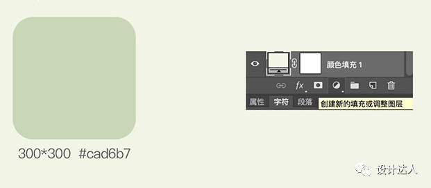 在PS中建立900*900px的画板,图层下方点击「创建新的填充或调整图层」图标选择”纯色”填充数值为#f2f4e5的浅绿色。用圆角矩形工具画一个300*300px,圆角为50px的圆角矩形,颜色为#cad6b7。
