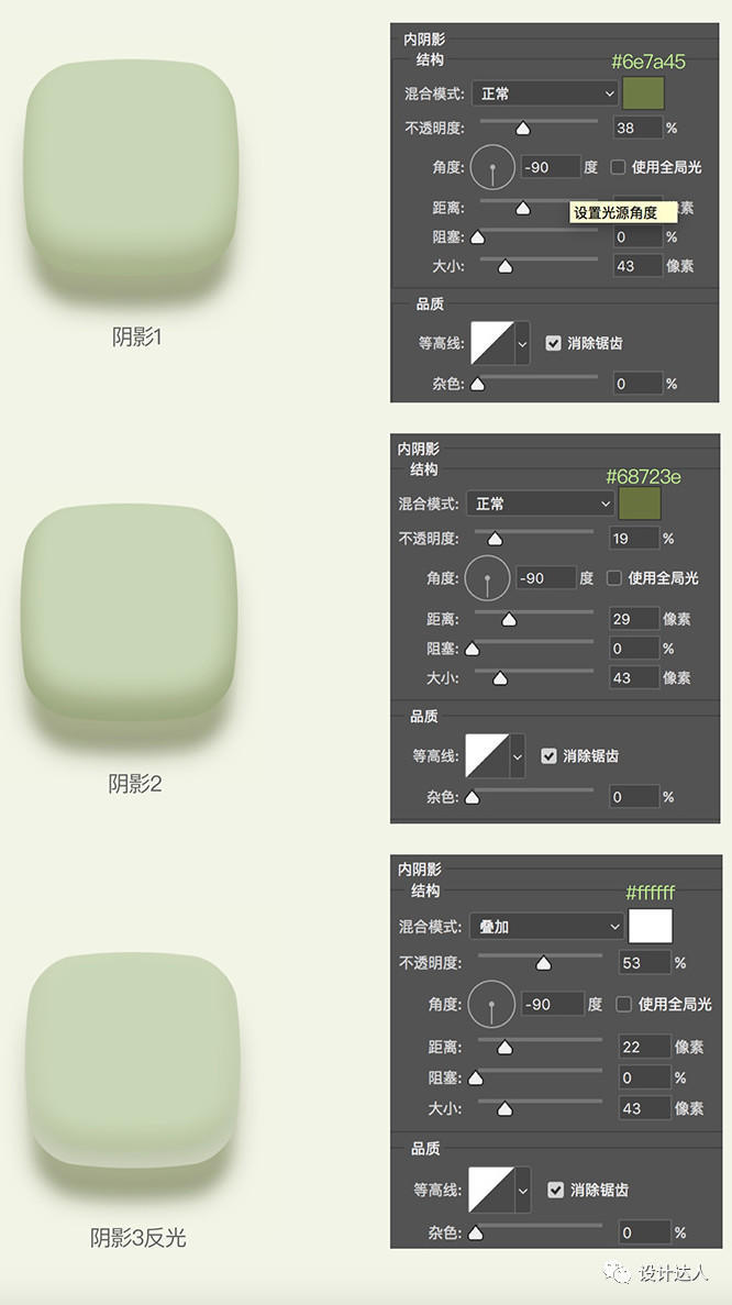 和上面同一图层阴影数值如下,注意等高线为正常模式,在这里我们加了3层内阴影
