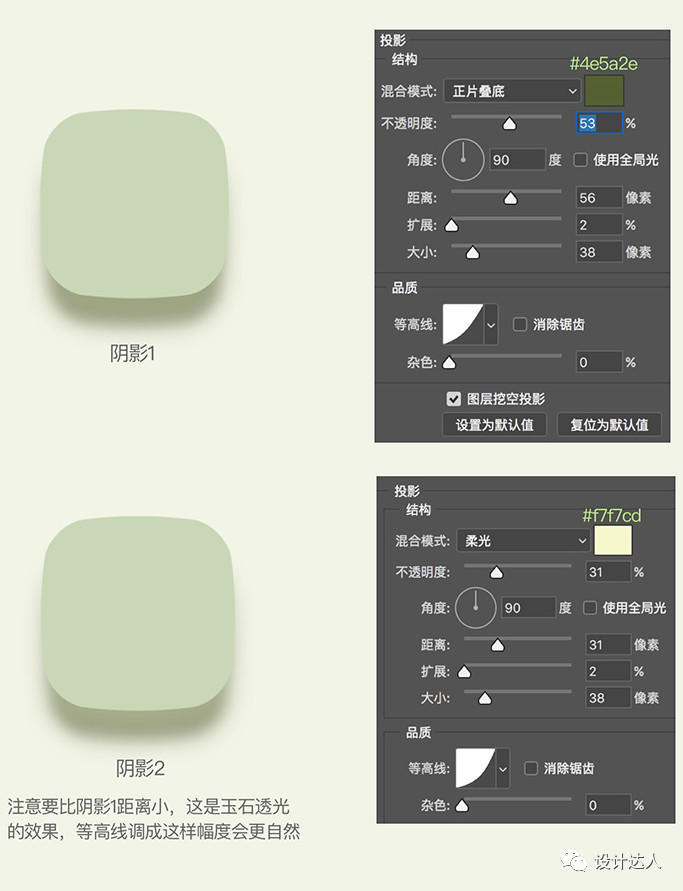 先点开图层样式添加阴影数值如下,阴影1颜色:#4e5a2e,阴影2在阴影1上面颜色:#f7f7cd