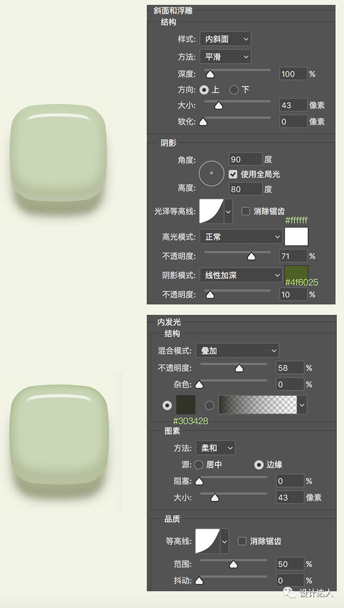 这一步是此Photoshop教程点睛之笔哦,请仔细制作,注意光滑质感光的角度,反光越强表面打磨越光滑!角度和等高线很关键,注意数值。然后提高立体感加内发光数值如下。