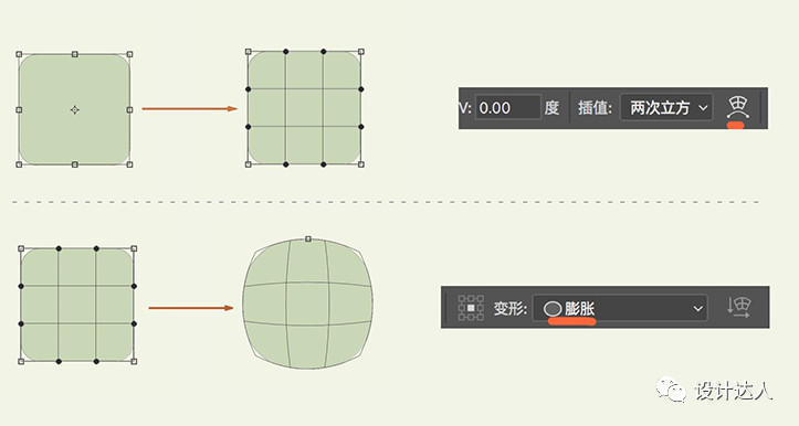 为了使底板看起来圆润我们要改变它的形状,control+t圆角矩形使其成为可变换模式后,顶上属性栏点击「自由变换和变形模式之间的切换」图标,然后再到顶部属性栏点击”自由”后选择”膨胀”后可调剂膨胀的数值(看你个人喜好)